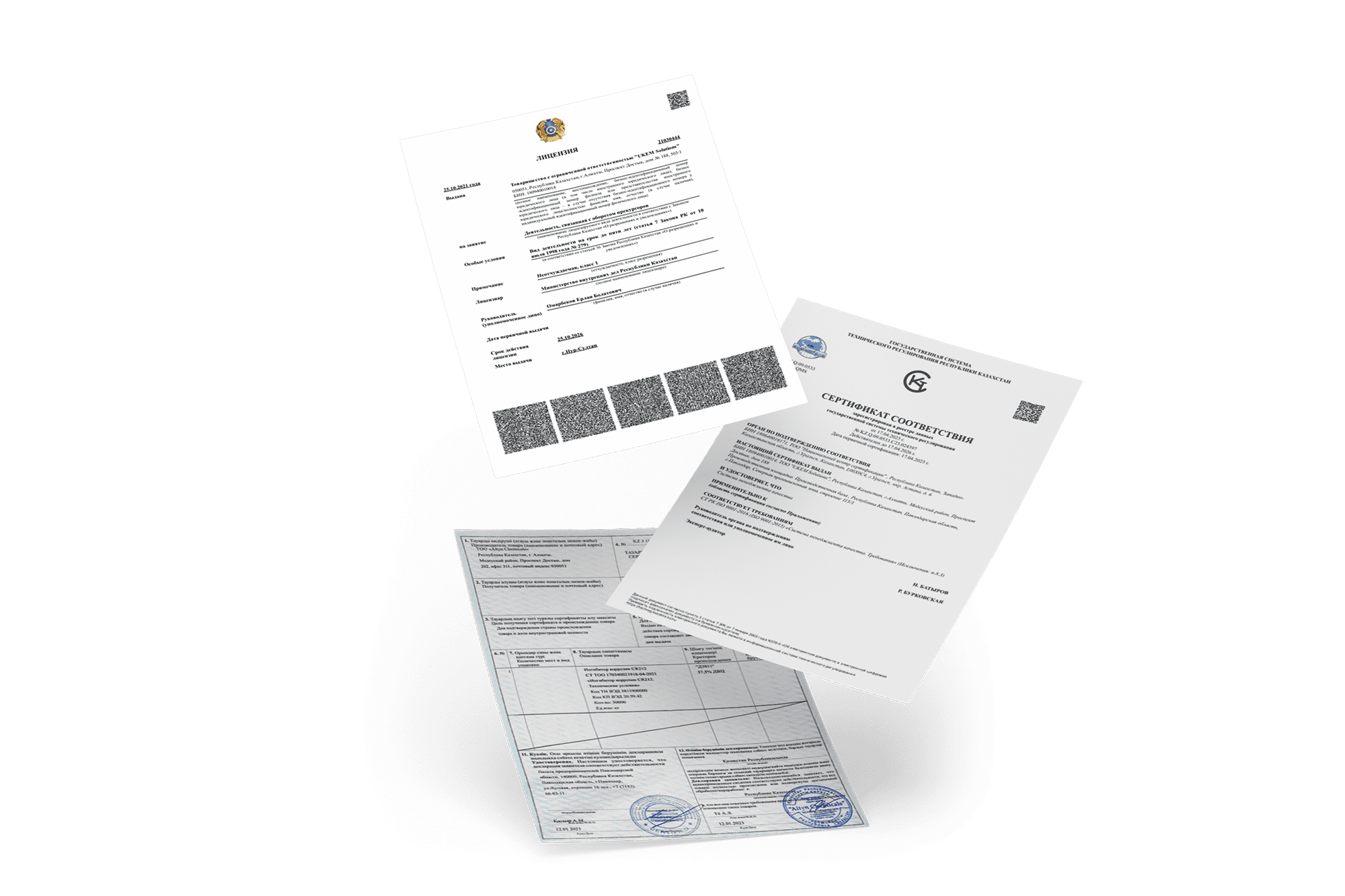 Наша компания имеет лицензию на деятельность, связанную с оборотом прекурсоров, системы менеджмента соответствуют международным стандартам и наша продукция имеет сертификатом СТ-KZ, подтверждающий 100% Казахстанское содержание.